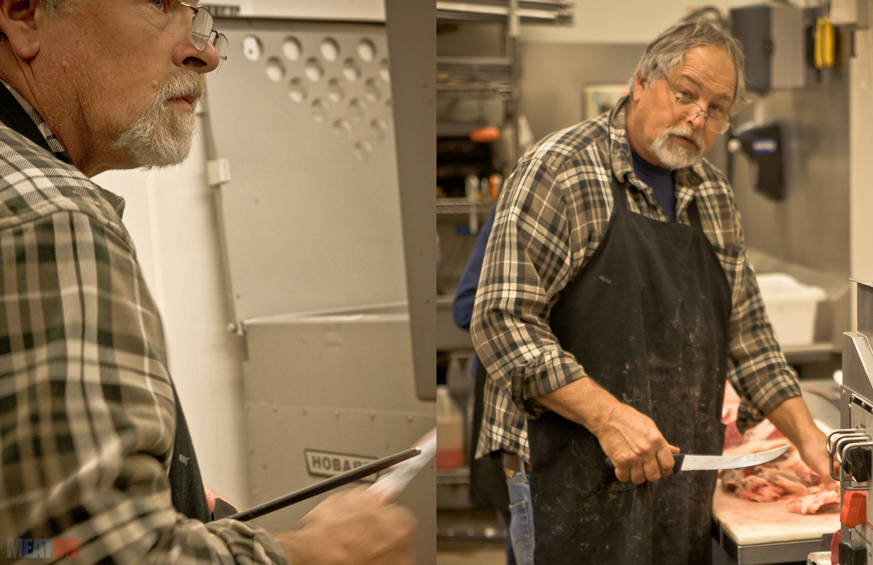 Jenny's father David Dewey sharpens his blade before beginning to cut meat.