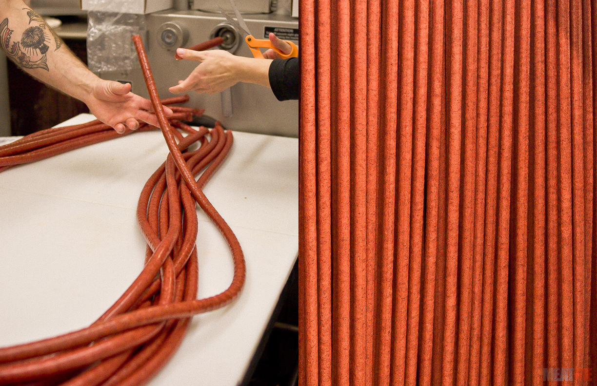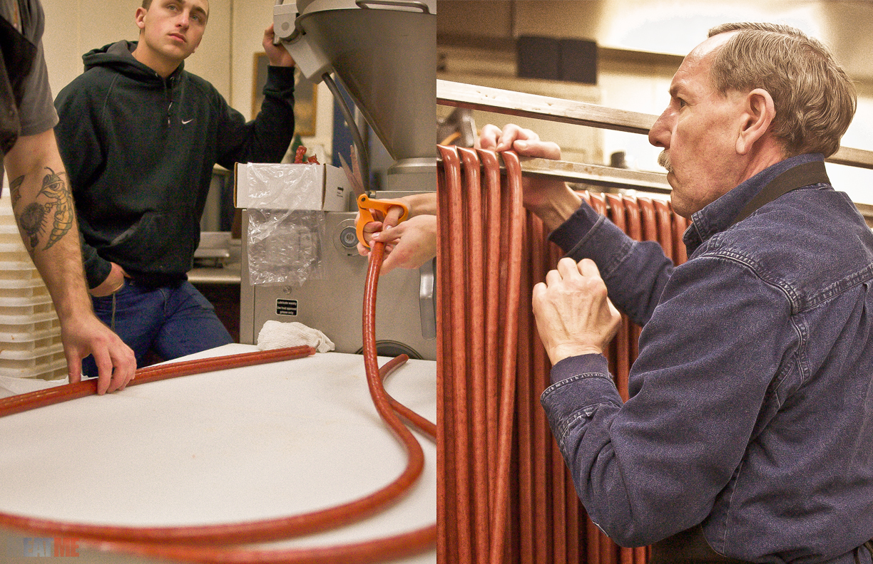 As the Mercedes (their Handtmann Stuffer) pumps out the snack sticks, they are cut and hung to be smoked.