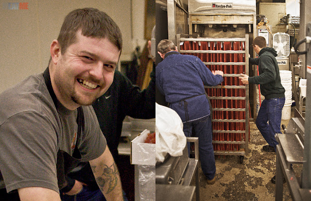 Jenny's brother, Jake, and butcher, Ken make snack sticks.