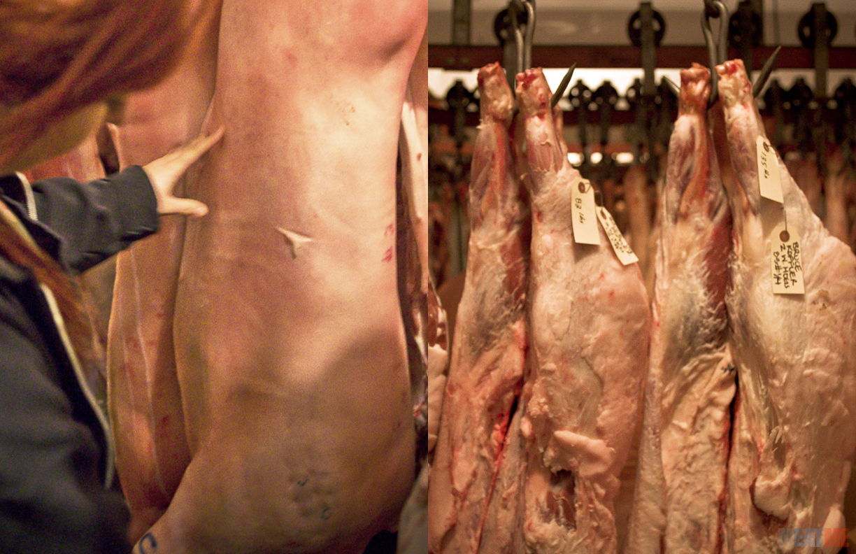 Carcasses hang as they age in the meat locker.