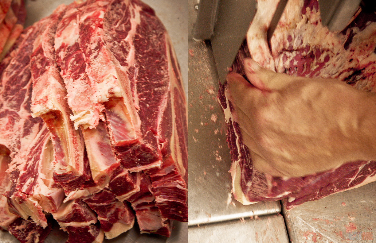 Dave cuts beef ribs with the meat band saw