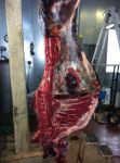 The meat was very very lean and a beautiful colour. None of that sticky stuff that you find in some wild meat. I could not see any signs of stress in the meat at all. For my first job at breaking down a wild animal I think a 700 pound bull moose is quite the animal. It takes a hunter about 4 years to get a ticket to hunt and kill a moose from the time they apply for a license so they are not an everyday job. He let it hang for 14 days without the skin on but he did wrap it in slightly damp blankets. Kept the temp down, he did a good job.